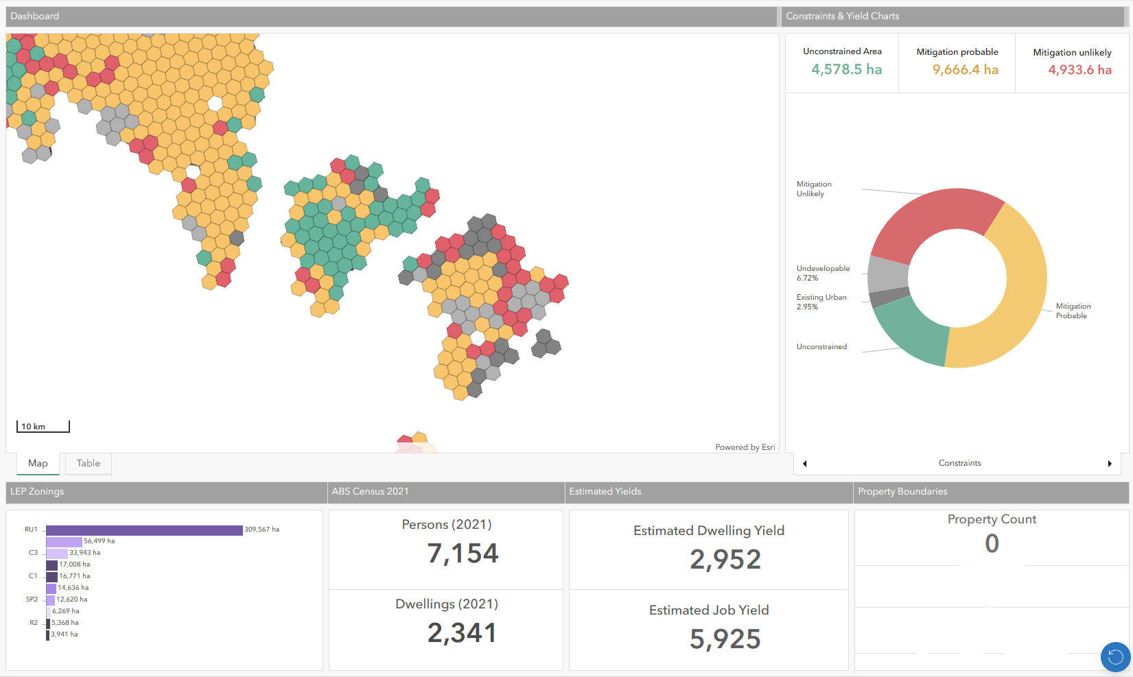 At The Spatial Lab, we've been providing a streamlined service to multiple clients, simplifying the interpretation of extensive constraint data. Our process organizes a multitude of known constraints, including slope, flooding, vegetation, and more, into two categories: mitigable and non-mitigable. This enables clients to access concise summaries of constrained and unconstrained areas, facilitating lot yield calculations and development cost assessments. These results empower property and area comparisons, aiding in identifying the most development-friendly and high-yield areas. The data is accessible through an interactive online dashboard, offering quick comparisons and informed decision-making.